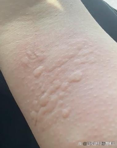 - 风团样丘疹: 皮肤上出现纺锤形的红色风团样丘疹,中心有时有一个小水疱。