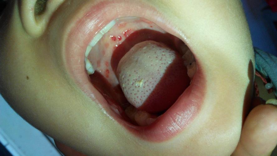 - 手足口病/疱疹性咽峡炎:这是学龄前儿童非常常见的疾病,除了口腔上颚,手、脚和臀部也可能出现皮疹,口腔内会伴有疼痛、流口水、拒食、发烧等症状,红点可能是小丘疹或疱疹。