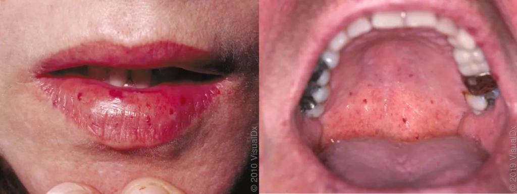- 红点迅速增多或扩散:不仅在上颚,口腔其他部位(如牙龈、舌头、内颊)甚至全身皮肤都出现了红点或瘀斑。