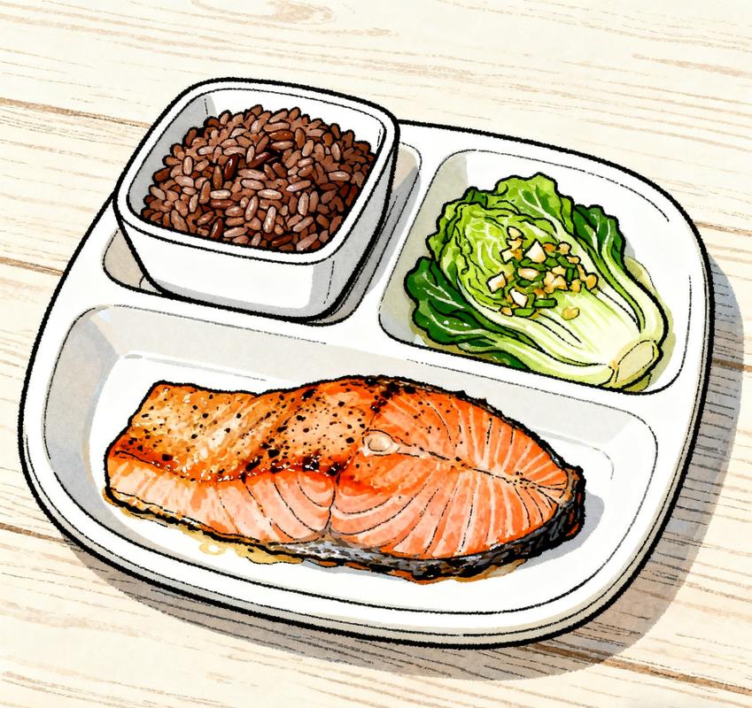 - 午餐:一份烤三文鱼,搭配清炒西兰花和一小份糙米饭,可以淋上用姜黄、橄榄油和柠檬汁调制的酱汁。