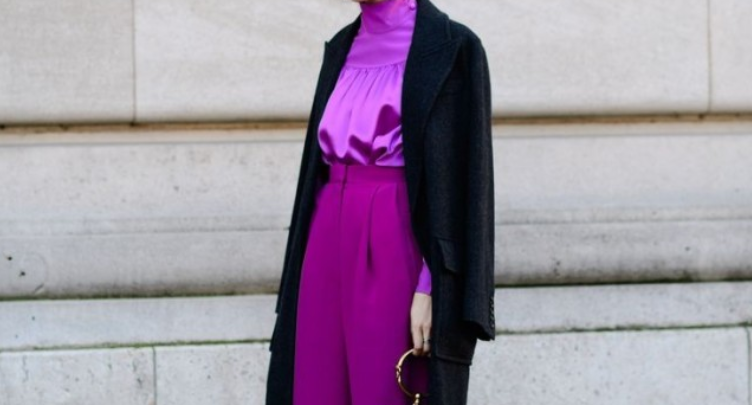 用不同材质和深浅的深紫色进行搭配,比如一件深紫色的丝质上衣,搭配一条垂坠感好的深紫色阔腿裤,整体造型统一、高级,气场十足。