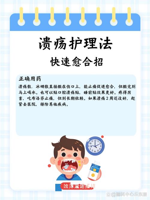 - 仔细刷牙: 使用软毛牙刷,动作轻柔,避免戳到溃疡,饭后用漱口水或盐水漱口,保持口腔清洁。