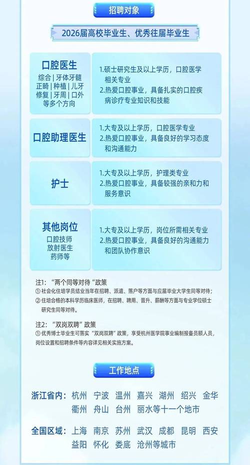 - 如果您是应届毕业生,可以关注 宁波大学、浙江大学医学院、温州医科大学 等设有口腔医学专业的院校就业指导中心网站或公众号,公立医院的“校园招聘”和“事业编制统考”是主要入口。