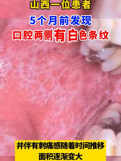 - 外观描述:这是一种常见的口腔黏膜疾病,它的表现形式多样,其中一种就是白色网状条纹,像蕾丝花边或细线一样交织在一起,周围可能伴有轻微的红色或充血背景,有时也会表现为白色斑块或丘疹。