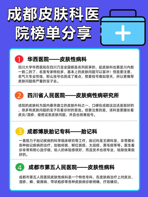 常见病可以考虑市三医院: 如果您只是常见的痤疮、湿疹、荨麻疹等问题,成都市第三人民医院的皮肤科是非常好的选择,它名气大、口碑好,而且相对前两家更容易挂到号,性价比很高。