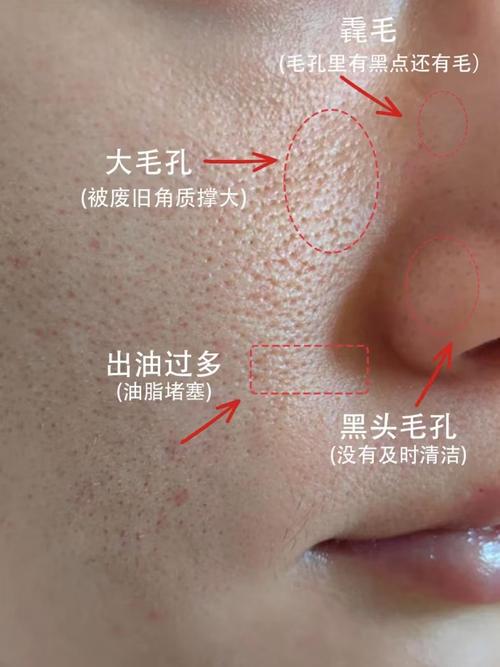- 鼻子:毛孔明显,容易有黑头、白头(粉刺)。