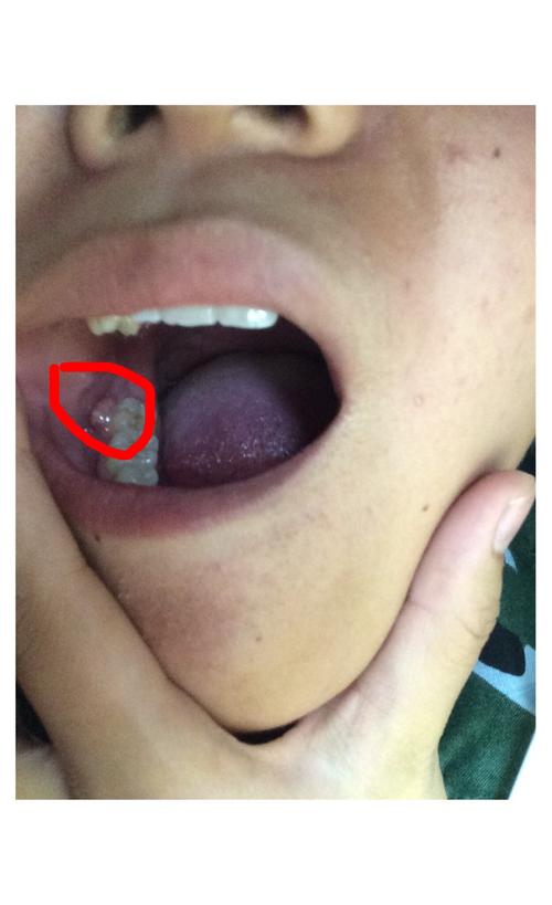 - 包块和炎症出现在最后面牙齿的牙龈区域。