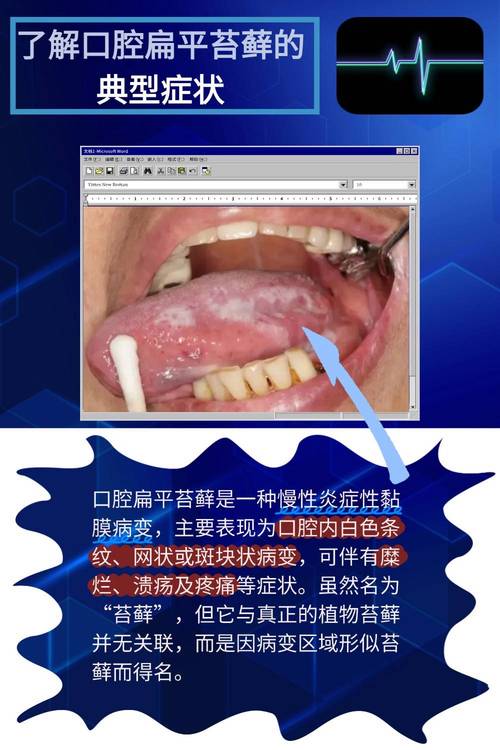 - 口腔扁平苔藓: 一种常见的慢性炎症性疾病,典型表现为口腔黏膜出现白色或灰色的条纹、网纹,或斑块,这些斑块摸起来可能感觉粗糙、增厚,患者可能伴有灼痛感或刺激感。