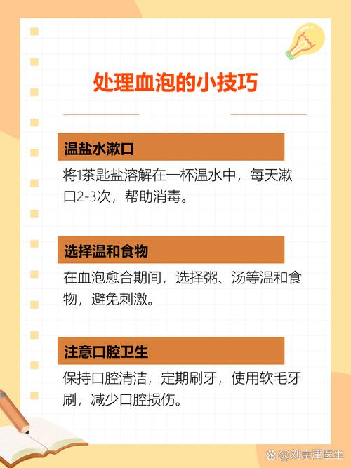 - 避免刺激:暂时不要再吃太热、太辣、太硬或酸的食物,以免刺激到血泡。