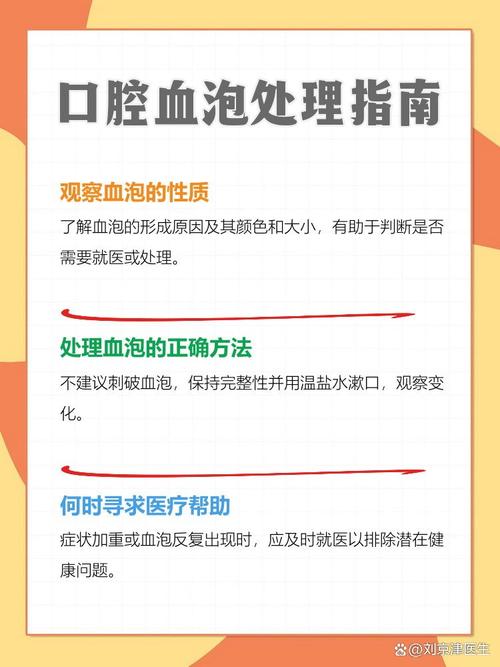 - 保持冷静,不要用舌头、牙齿或手去挤压、舔舐或撕扯血泡,强行弄破会增加感染风险,并可能引起更严重的出血。