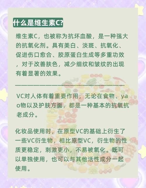 - 强大的抗氧化作用:维生素C能有效清除自由基,防止紫外线、污染等外界因素对皮肤造成氧化损伤,从而预防因光老化导致的肤色暗沉、色斑和皱纹。