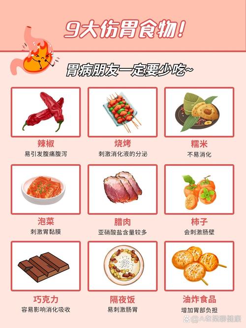 - 油腻油炸类:炸鸡、薯条、肥肉等,难消化,会增加胃的负担。