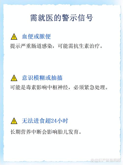 (图片来源网络,侵删)- 剧烈呕吐与腹泻: 这是最常见的症状,频繁的呕吐和腹泻会导致短时间内大量体液和电解质流失,造成脱水和电解质紊乱,这不仅让妈妈感到虚弱,更重要的是,母体血容量减少,流向子宫的血液量也可能随之下降,这可能导致胎儿出现暂时的缺氧情况,尤其是在孕早期,胚胎对缺氧环境极为敏感。