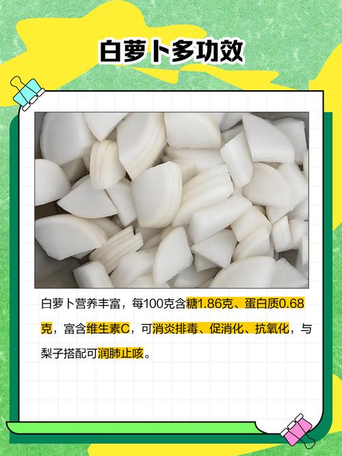 - 白萝卜: “冬吃萝卜夏吃姜”,白萝卜能清热化痰、下气宽中,生吃可以化痰热,熟吃(如炖汤)能润肺,与排骨、羊肉同炖是很好的选择。