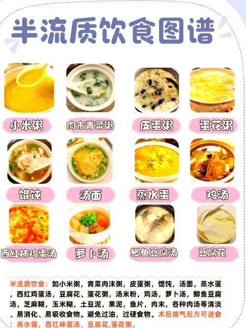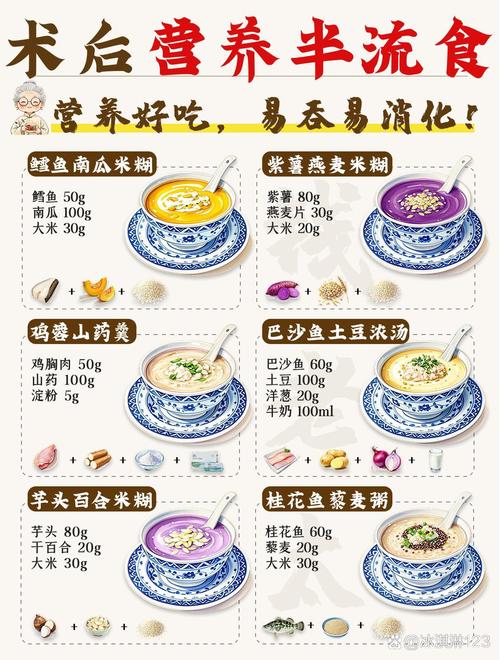 - 从流质到半流质,再到软食和普食:这是一个循序渐进的过程,刚做完手术(尤其是胃肠道手术),应从清流质(如水、米汤)开始,然后过渡到全流质(如蛋花汤、藕粉),再到半流质(如粥、烂面条),最后恢复到软食(如软米饭、肉末)和普通饮食。