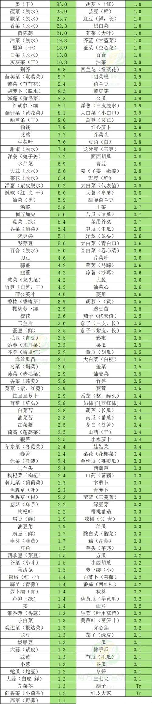以下排行榜综合了血红素铁和非血红素铁的来源,并标注了每100克食物的铁含量。