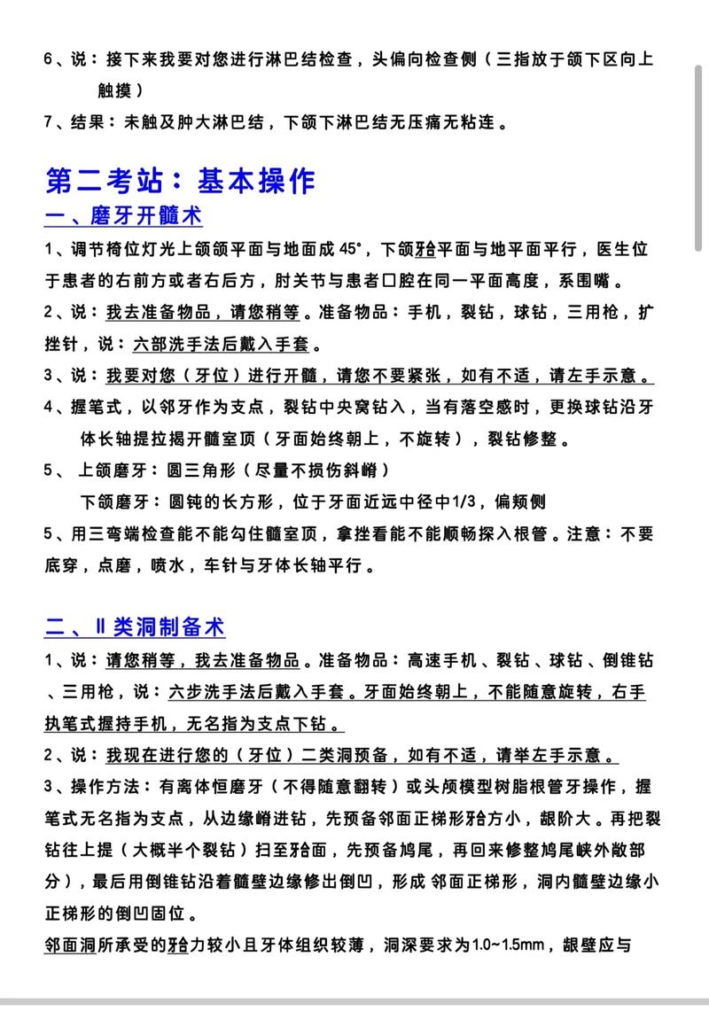 - 基本操作:如口腔局部麻醉、无菌操作、开髓术、洁治术、窝沟封闭、牙拔除术(模型)等。