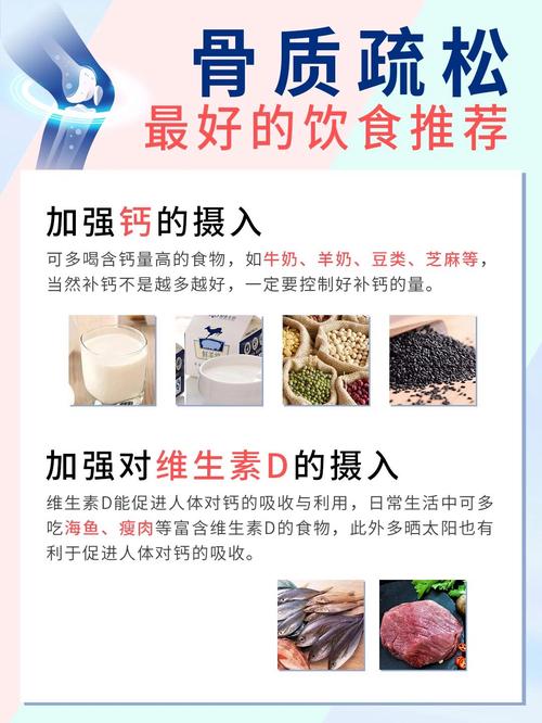 骨质疏松症患者宜吃哪些食物? 核心营养素及对应食物 钙 - 骨骼的“基石” 钙是骨骼最主要的矿物质成分,确保充足的钙摄入是预防和治疗骨质疏松的基础。(图片来源网络,侵删) 高钙食物推荐: 奶制品(最佳来源,吸收率高): 牛奶、酸奶、奶酪:每天保证300-500毫升的牛奶或等量奶制品是补钙的黄金标准,选择无糖或低糖酸奶更佳。 豆制...