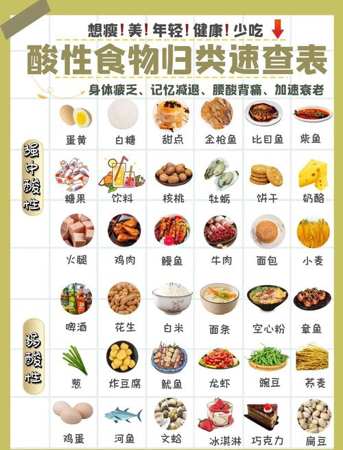 哪种食物属于酸性食物? 这个标准被称为“食物的酸碱性”或“食物的成酸/成碱效应”。(图片来源网络,侵删) 核心原则 酸性食物:指含有硫、磷、氯等非金属元素较多的食物,经过人体代谢后,最终产生的代谢产物(如硫酸、盐酸等)呈酸性,这类食物会使尿液的pH值降低。 碱性食物:指含有钾、钠、钙、镁等金属元素较多的食物,经过人体代谢后...