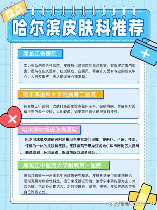 哈尔滨皮肤病哪家医院好? 哈尔滨主要皮肤病医院推荐 哈尔滨的皮肤病诊疗资源主要集中在公立三甲医院和部分专科医院,以下是几家口碑和实力都比较突出的医院:(图片来源网络,侵删) 哈尔滨医科大学附属第一医院 皮肤科 医院性质: 公立三甲医院,黑龙江省综合实力最强的医院之一。 科室优势: 专家团队强大: 汇集了省内最顶尖的皮肤科专家...