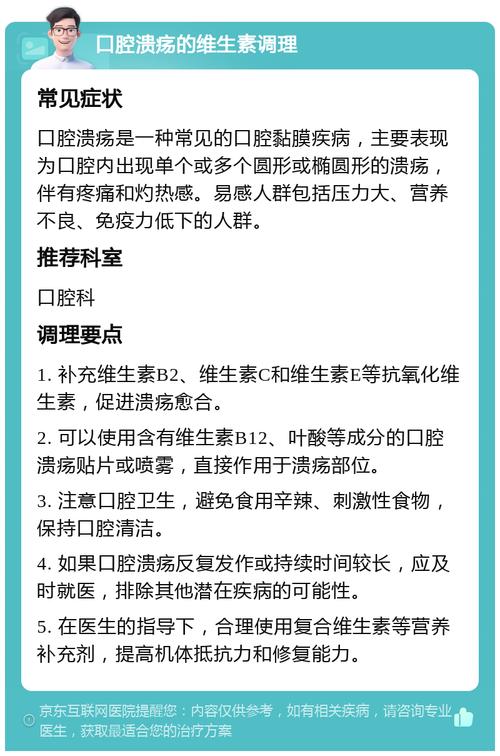口腔溃疡缺哪种维生素? 下面我将为您详细解释,并总结一个清晰的要点。(图片来源网络,侵删) 主要与口腔溃疡相关的维生素 最常被提及、且科学研究证据也相对充分的维生素主要有以下几种: 维生素B族 (特别是 B2、B6、B12、叶酸) 维生素B族是维持口腔黏膜健康和细胞代谢的关键营养素,它们是水溶性的,人体无法大量储存,所以需...