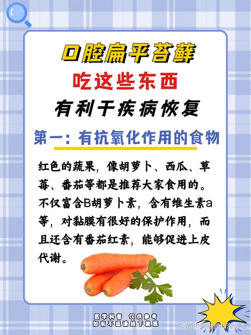 口腔扁平苔藓吃哪种食物能治好? 口腔扁平苔藓被认为是一种与免疫、精神压力、内分泌、感染等多种因素相关的慢性炎症性疾病,它的治疗需要遵循医嘱,可能包括局部用药、全身用药等。(图片来源网络,侵删) 饮食在口腔扁平苔藓的管理中,扮演着“辅助”和“支持”的角色,而不是“治疗”的角色。 其主要目标是: 减轻刺激:避免食用会刺激或损伤口腔黏膜...