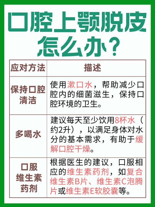 口腔上颚破皮是何原因? 导致口腔上颚破皮的原因多种多样,主要可以分为以下几大类:(图片来源网络,侵删) 物理性损伤(最常见) 这是导致上颚破皮最主要的原因,通常是由于外力或摩擦造成的。 硬物划伤或烫伤: 烫伤:这是最常见的原因之一,吃太烫的食物(如火锅、热汤、刚出锅的饭菜)时,高温会直接烫伤上颚的黏膜,导致红肿、起泡甚至破...