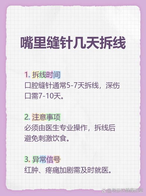 口腔缝针后几天能消肿? 大部分口腔缝针的肿胀会在3-7天内开始明显消退,1-2周内基本恢复正常。(图片来源网络,侵删) 下面是一个更详细的恢复阶段和时间线,供您参考: 口腔缝针后消肿时间线 第一阶段:严重肿胀期 (术后1-3天) 时间: 手术当天到术后第2-3天。 表现: 这是肿胀最严重的时期,嘴唇、脸颊、甚至眼眶周围都可...