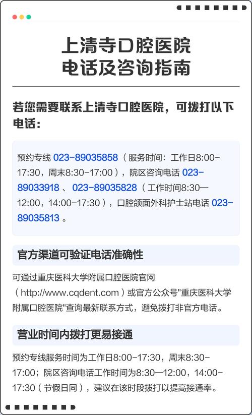 上清寺口腔科医院电话是多少? 重点推荐(位于上清寺或核心区域) 这几家是距离上清寺最近或知名度最高的口腔机构,您可以优先考虑。(图片来源网络,侵删) 重庆医科大学附属口腔医院(渝中院区) 这是重庆市口腔医疗领域的“天花板”,公立三甲医院,拥有最顶尖的专家和设备,是处理复杂口腔问题和疑难杂症的首选。 医院地址:重庆市渝中区上清寺路...