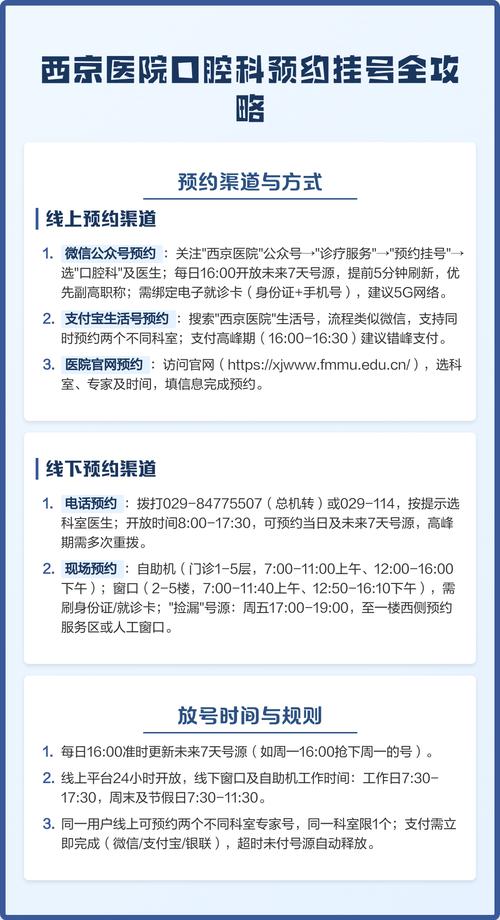 西京口腔医院挂号难不难?怎么快速挂上? 以下是所有官方且有效的挂号渠道,您可以根据自己的情况选择最合适的一种:(图片来源网络,侵删) 核心挂号渠道(推荐首选) 微信公众号(最推荐,最方便) 这是目前最主流、最便捷的挂号方式,可以提前7天预约。 操作步骤: 关注公众号: 在微信中搜索并关注 “西京医院” 官方公众号(注意:不是“西京口腔医院...
