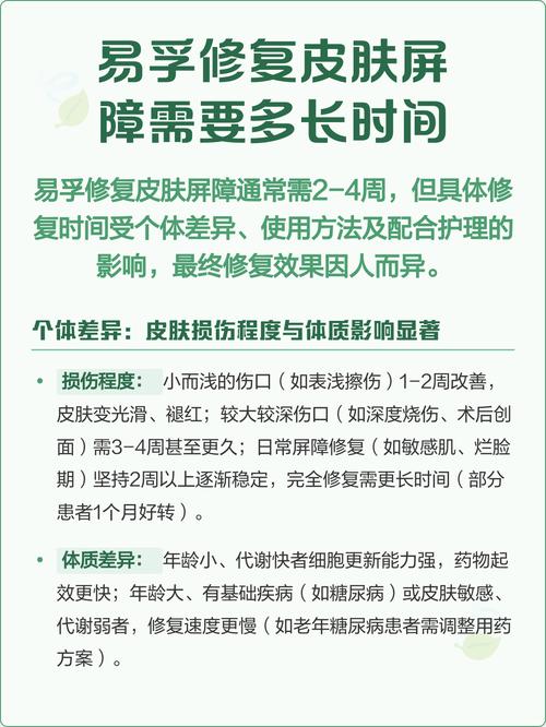 皮肤屏障修复到底要多久? 这是一个非常好的问题,也是很多人在护肤时最关心的问题之一,皮肤屏障修复的时间没有一个固定的答案,它受到多种因素的综合影响。(图片来源网络,侵删) 可以概括为一句话:轻微损伤可能几周,严重损伤则可能需要数月甚至更久。 下面我们来详细拆解影响修复时间的几个关键因素,并给出一个大致的时间参考。 影响皮肤屏...