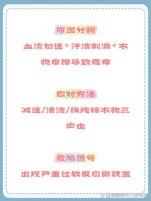 跑步时皮肤发痒,到底是为啥? 最常见的生理性原因(物理性荨麻疹) 这是最常见的原因,医学上称为胆碱能性荨麻疹或热性荨麻疹。(图片来源网络,侵删) 原理:当您跑步时,体温会升高,身体为了散热会出汗,汗液中的乙酰胆碱会刺激皮肤下的肥大细胞,导致它们释放组胺,组胺会使毛细血管扩张、通透性增加,从而在皮肤表面引起小风团(类似蚊子包,但通...