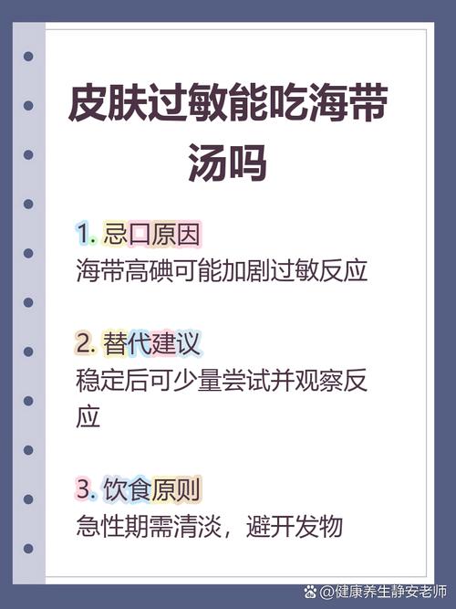 皮肤过敏能吃海带吗? 这是一个非常好的问题,因为皮肤过敏期间的饮食确实需要特别注意。(图片来源网络,侵删) 对于皮肤过敏的人来说,海带可以吃,但需要谨慎,并且因人而异。 它不是一种绝对禁止的食物,但也不是所有人都适合在过敏期间食用。 下面我将从几个方面详细解释,帮助您判断自己是否可以吃海带: 海带可能对皮肤过敏有好处的一...