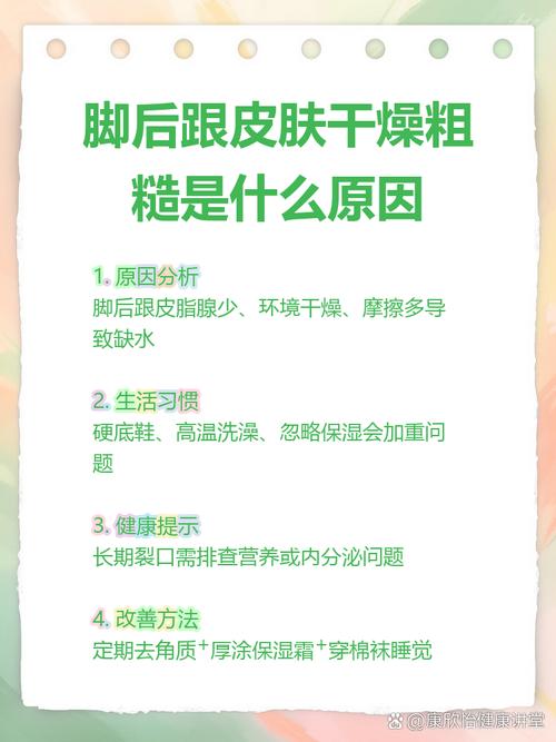 脚皮肤干燥究竟是什么原因导致的? 以下是导致脚部皮肤干燥的主要原因,可以分为几大类:(图片来源网络,侵删) 环境与生活习惯因素 (最常见) 水分流失过多 (脱水) 天气干燥: 冬季气候寒冷干燥,空气湿度低,皮肤水分很容易蒸发,导致脚部皮肤干燥、脱皮。 高温环境: 长时间待在空调房或暖气房内,会加速皮肤水分流失。 过度清洁: 频繁用热...