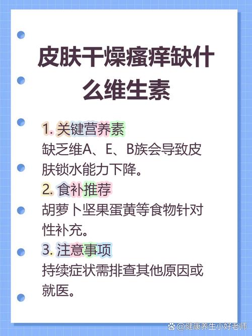皮肤干痒是缺哪种维生素? 在探讨维生素之前,我们先了解一下皮肤干痒的其他常见原因,这有助于您更全面地判断:(图片来源网络,侵删) 环境因素:空气干燥(秋冬季节、空调房)、紫外线过强、风大等。 皮肤屏障受损:过度清洁、使用刺激性产品、频繁去角质等,导致皮肤锁水能力下降。 皮肤疾病:湿疹、皮炎、银屑病、鱼鳞病等。 年龄因素:随着...