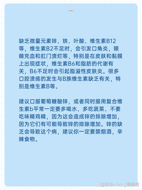口腔溃疡缺哪种维生素? 下面我将为您详细解析与口腔溃疡最相关的几种维生素和营养素,以及其他常见诱因。(图片来源网络,侵删) 最可能相关的维生素和营养素 维生素B族(特别是B2、B12、叶酸) 这是最常被提及与口腔溃疡相关的营养素群,B族维生素是维持口腔黏膜健康、促进细胞修复和代谢的关键物质。 维生素B2 (核黄 Ribof...