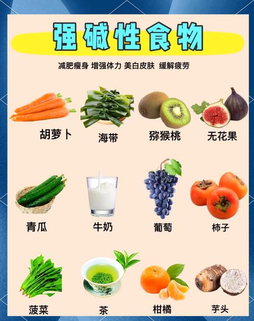 - 碱性食物: 通常指含有丰富钾、钠、钙、镁等金属元素的食物,这些元素在人体内代谢后,最终产物呈碱性。