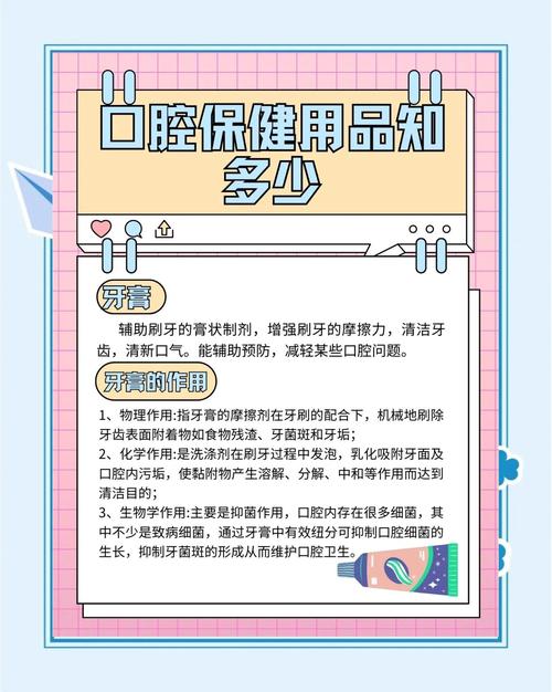 - 牙刷:选择软毛、小头的牙刷,能更好地清洁牙齿邻面和牙龈沟,建议每3-4个月更换一次,或当刷毛变形时及时更换。