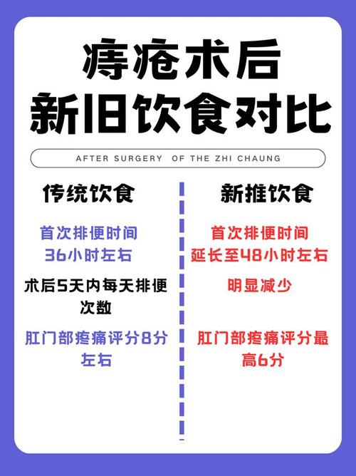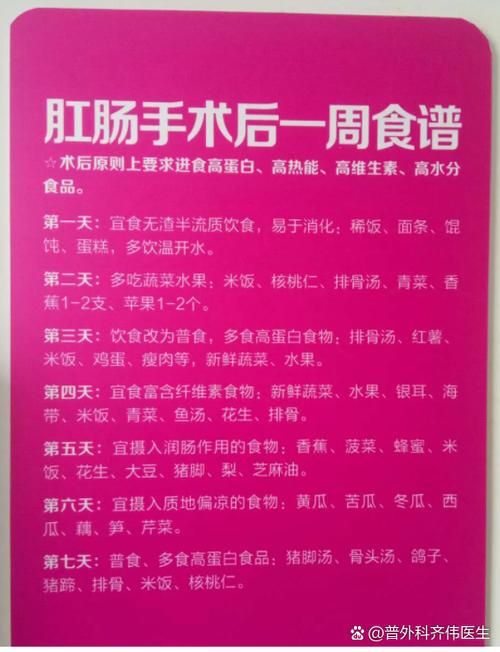 - 术后前几天:通常建议从流质或半流质食物开始,如米汤、藕粉、蛋羹、烂面条等,确保排便顺畅且不费力。