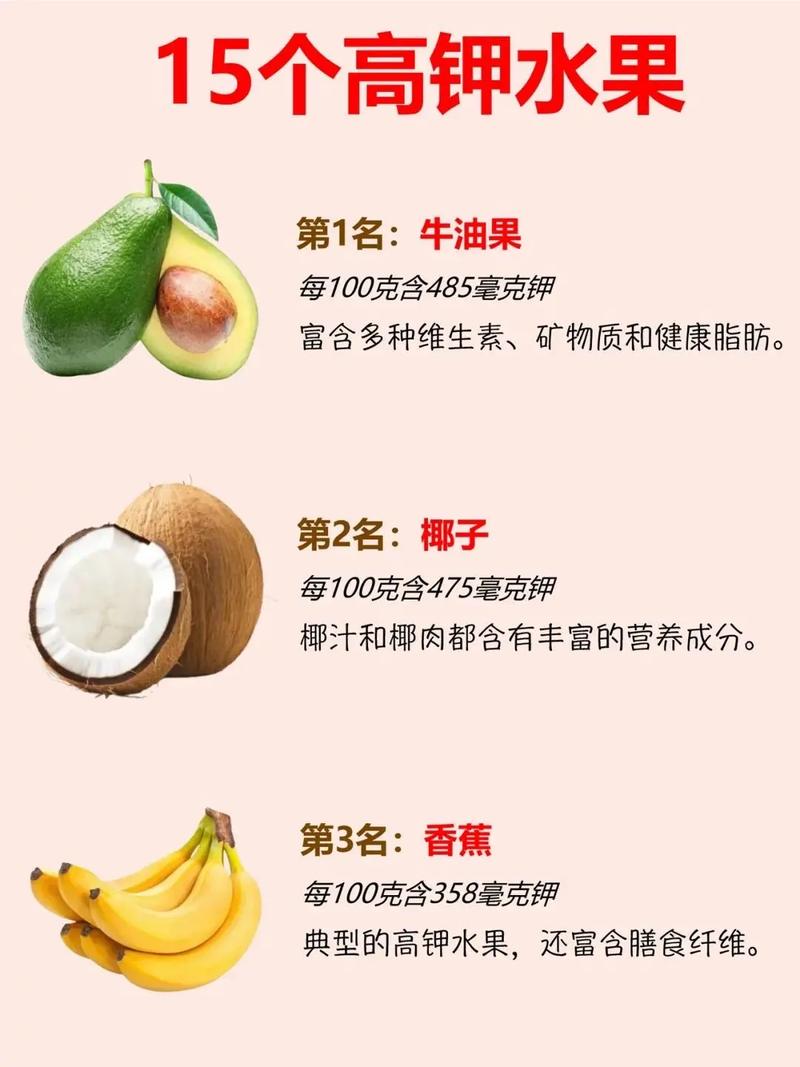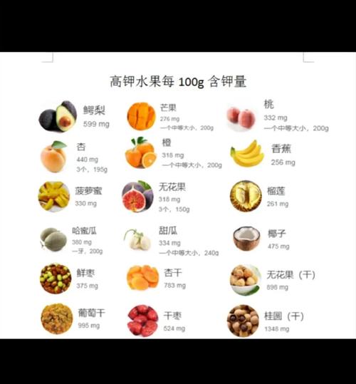 - 经典高钾水果:香蕉是大家最熟知的高钾水果之一,一个中等大小的香蕉大约含有400-450毫克的钾。