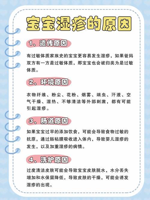 - 避免过热: 不要给宝宝穿盖过多,出汗会刺激湿疹,摸宝宝的后颈,温热不出汗就是最合适的。