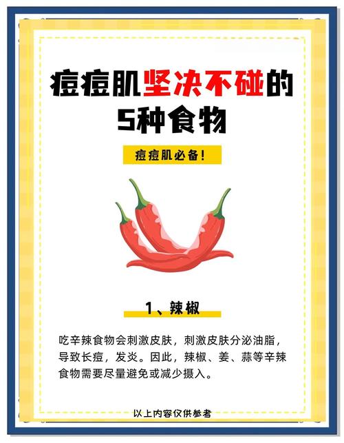 - 具体食物: 辣椒、花椒、大蒜、芥末等,如果你是“易痘体质”,建议在痘痘爆发期少吃。