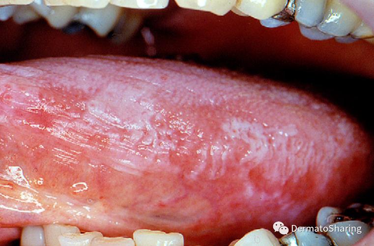 - 牙龈:表现为牙龈发红、肿胀、糜烂,表面有白色条纹,易与牙周病混淆。
