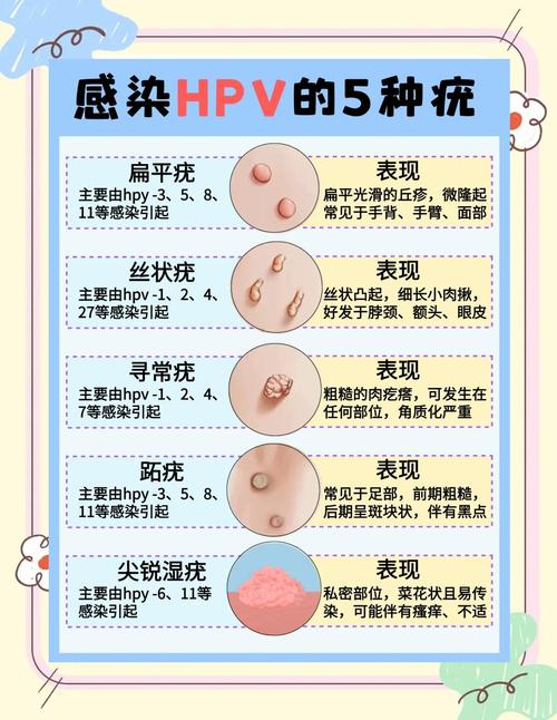 - 其他皮肤区域: 某些类型的HPV可以感染身体其他部位的皮肤,引起疣,如: