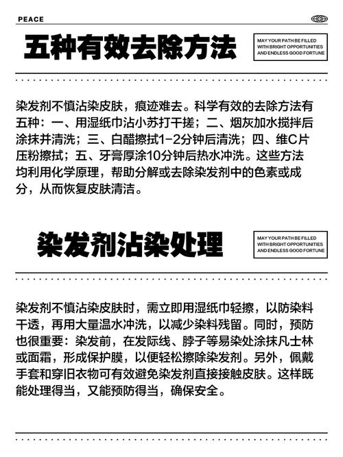 - 做法: 在药店或美发用品店可以买到,按照产品说明使用,通常是涂抹在染色处,等待指定时间后擦掉或冲洗。
