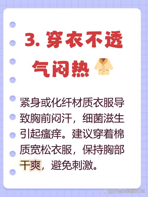 - 选择纯棉、透气性好的内衣,避免穿紧身化纤材质的文胸。