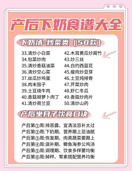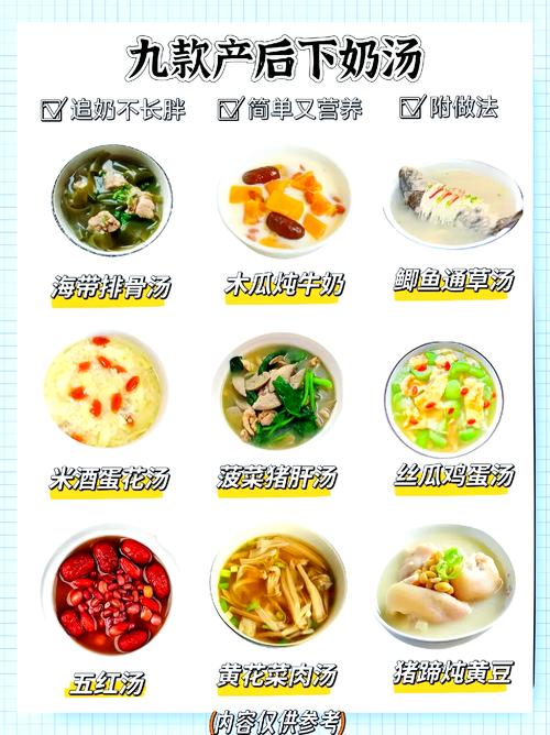 - 鸡汤/排骨汤:提供优质蛋白质和多种微量元素,帮助身体恢复和提升免疫力,为产奶提供能量支持。