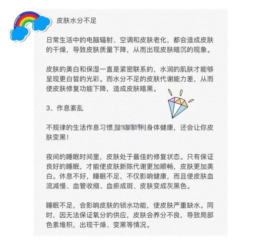 - 保证充足睡眠: 晚上11点到凌晨2点是皮肤细胞修复和再生的关键时期,熬夜会导致内分泌失调,黑色素分泌增加。