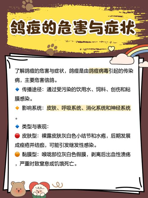 - 接种鸽痘疫苗是预防该病最有效的方法,每年定期接种。
