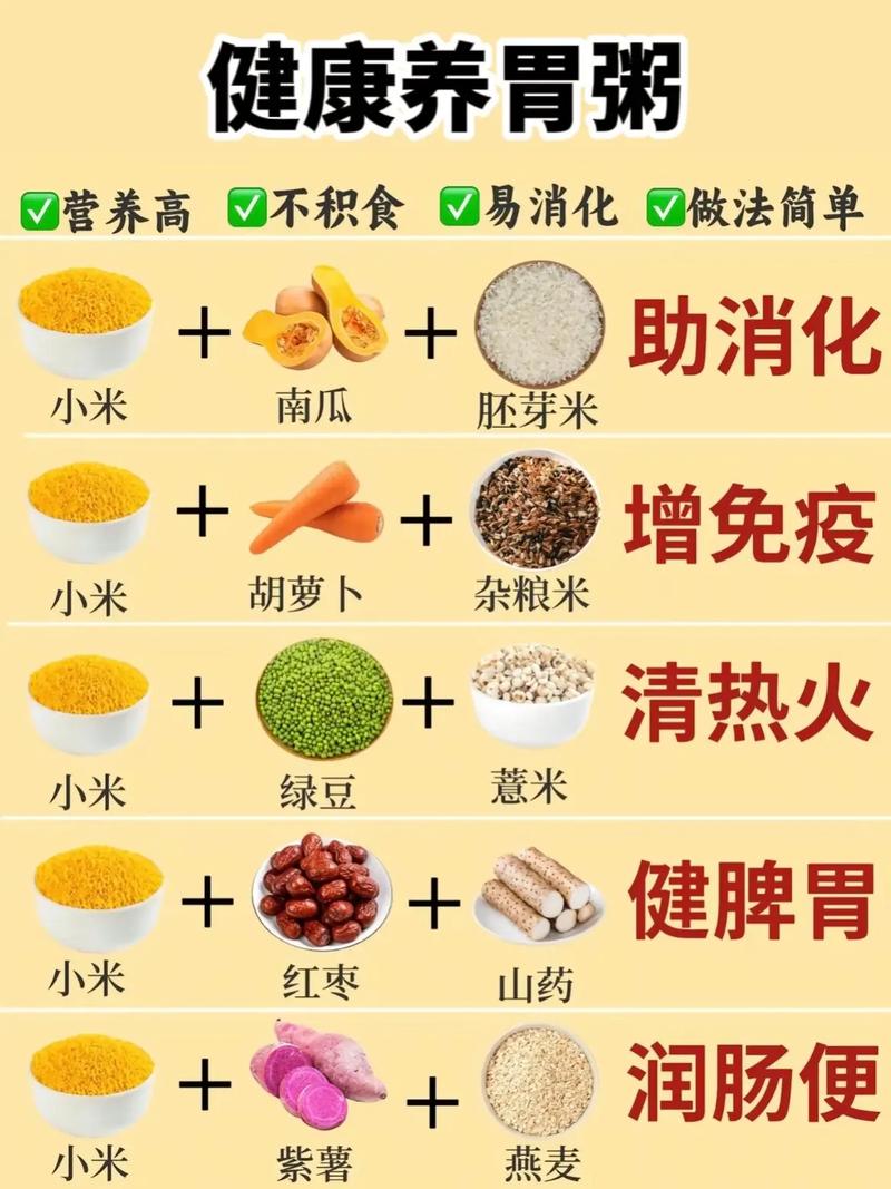 - 小米粥/大米粥: 粥的含水量高,经过长时间熬煮,淀粉糊化,非常容易消化吸收,是养胃的“黄金食物”。